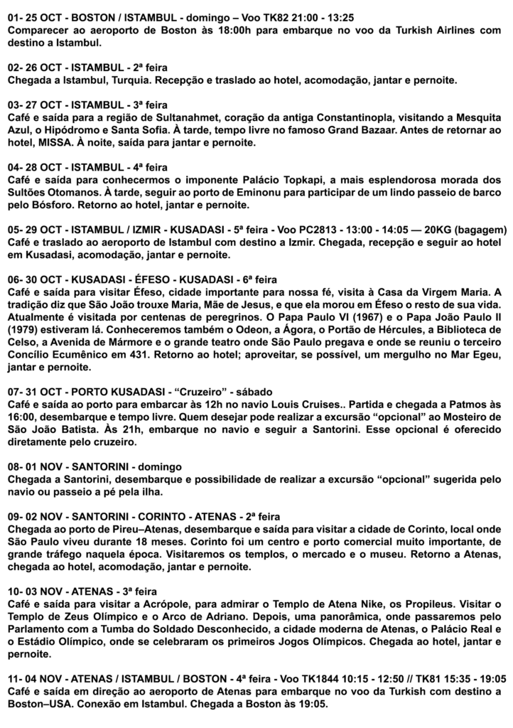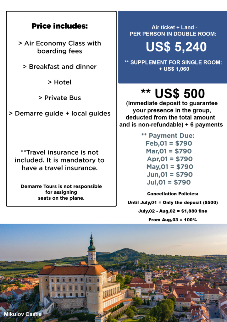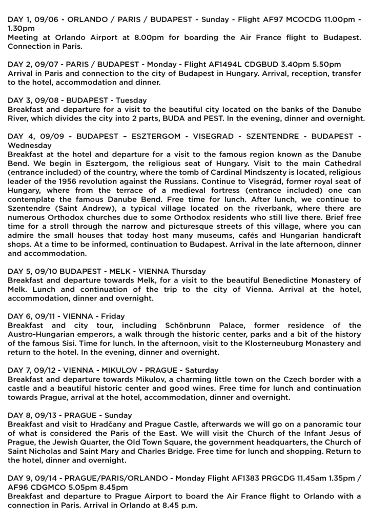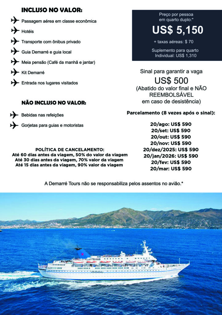 Nos roteiros onde disponibilizamos meia pensão (café e jantar), recomendamos que o passageiro leve um mínimo de $30 dólares por dia (ou $30 euros por dia, dependendo da moeda do país visitado).