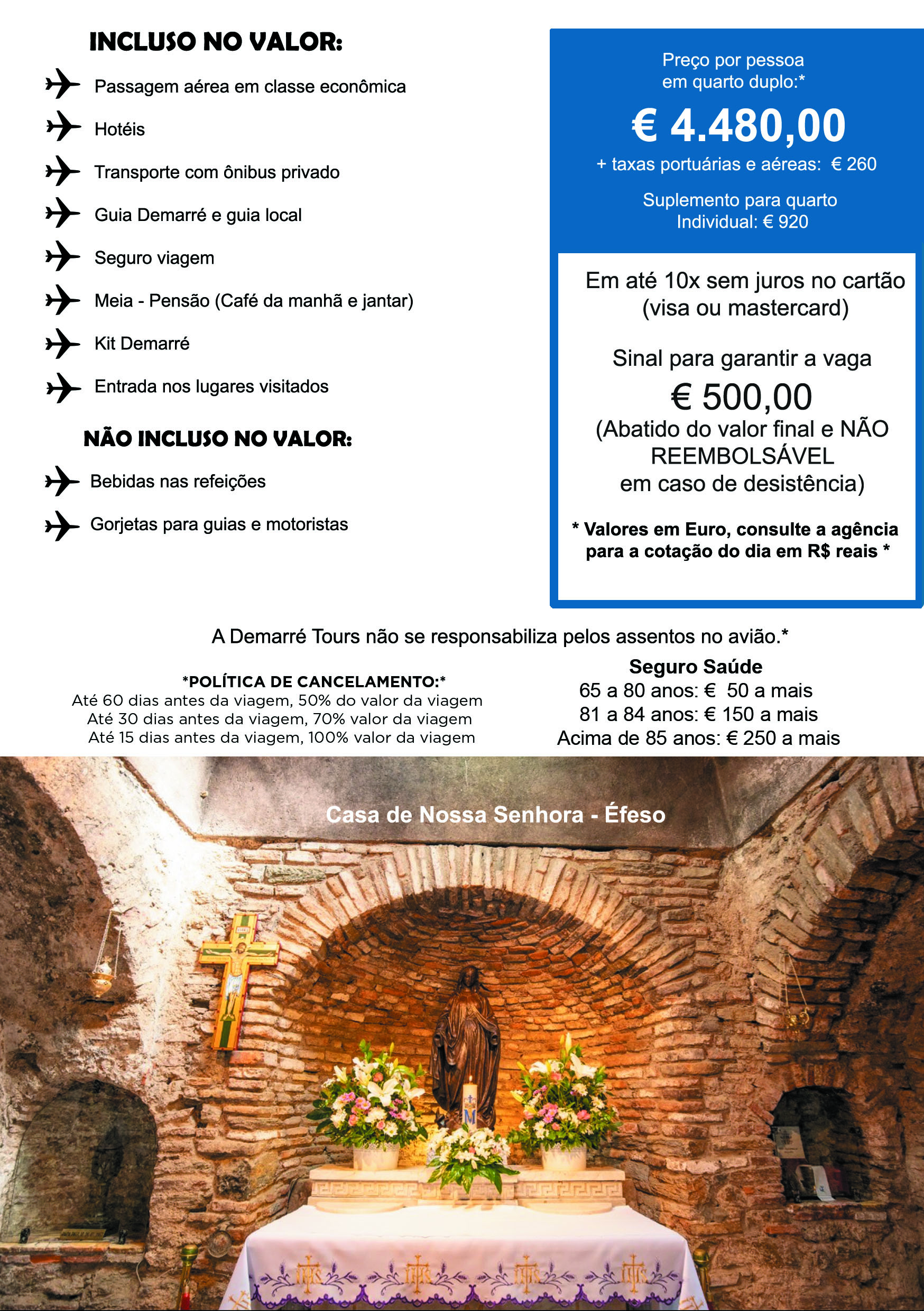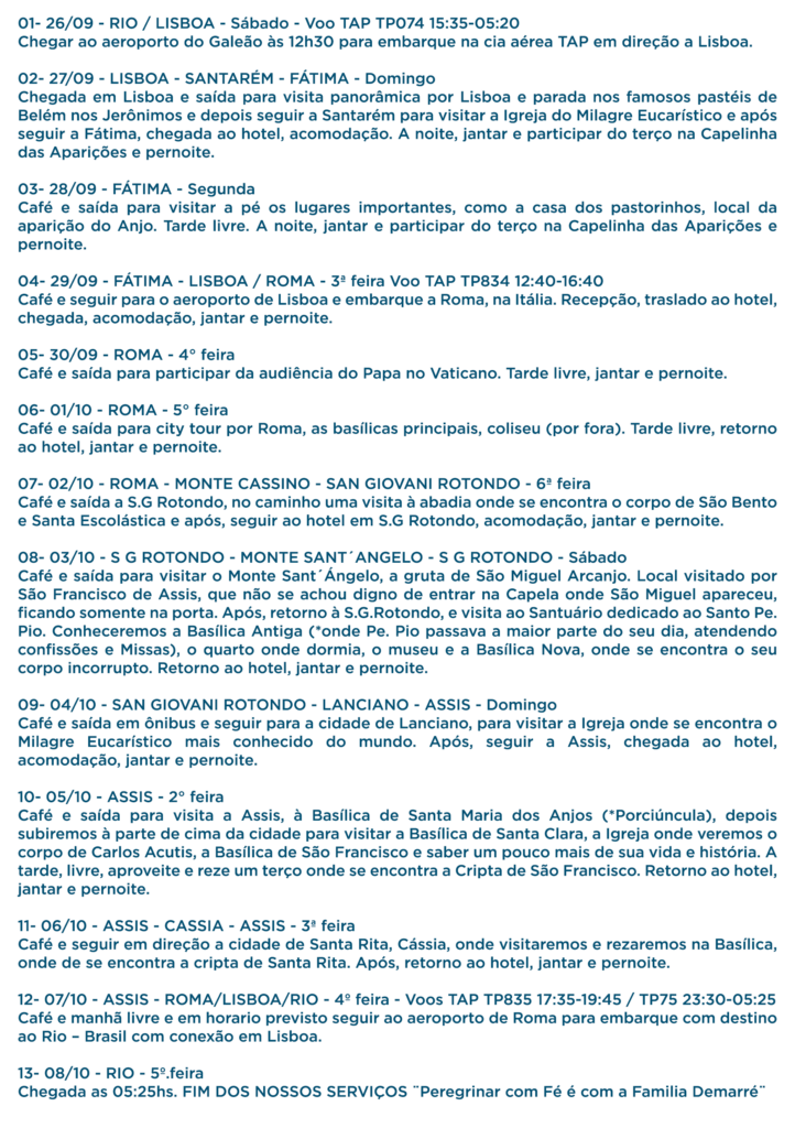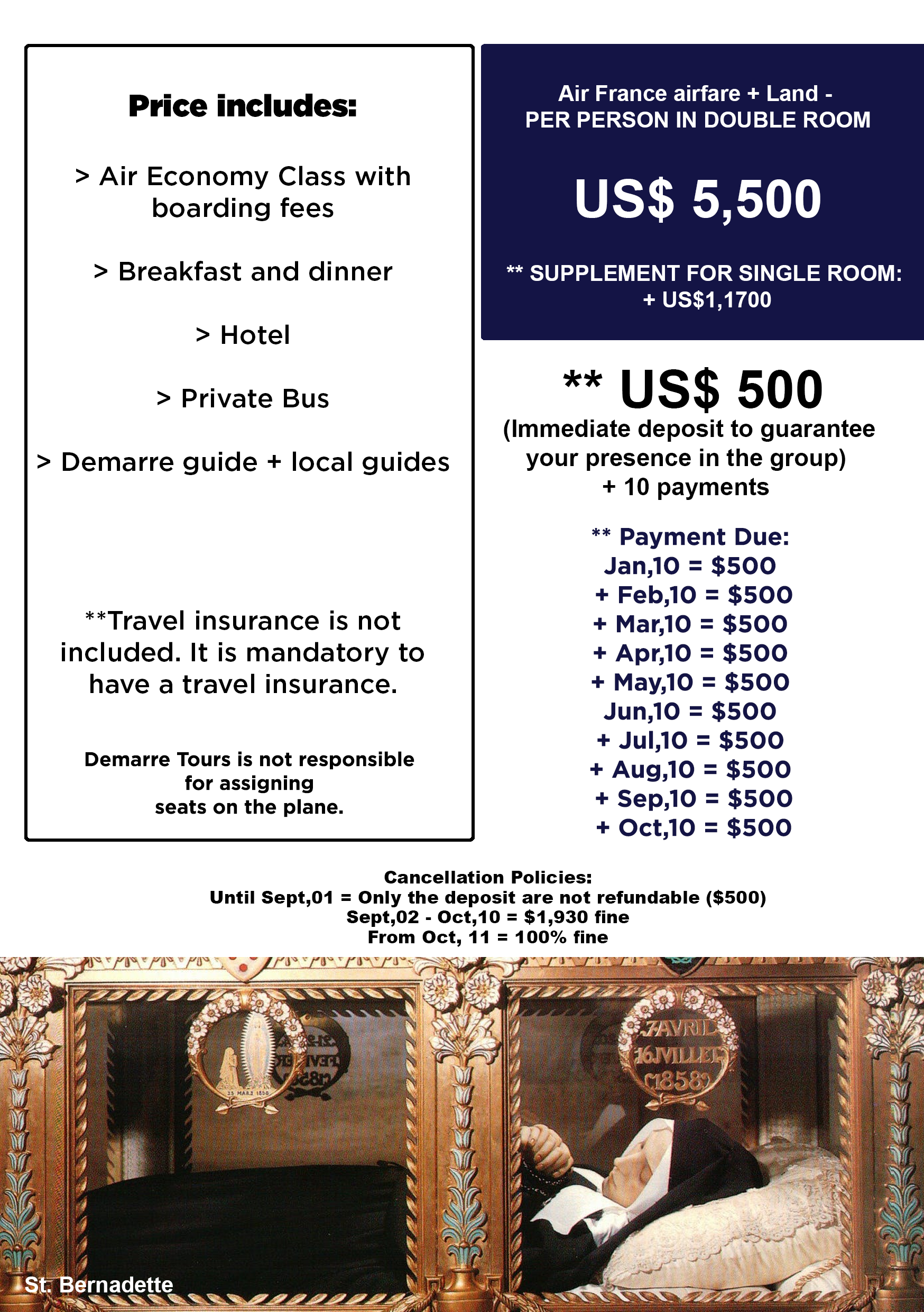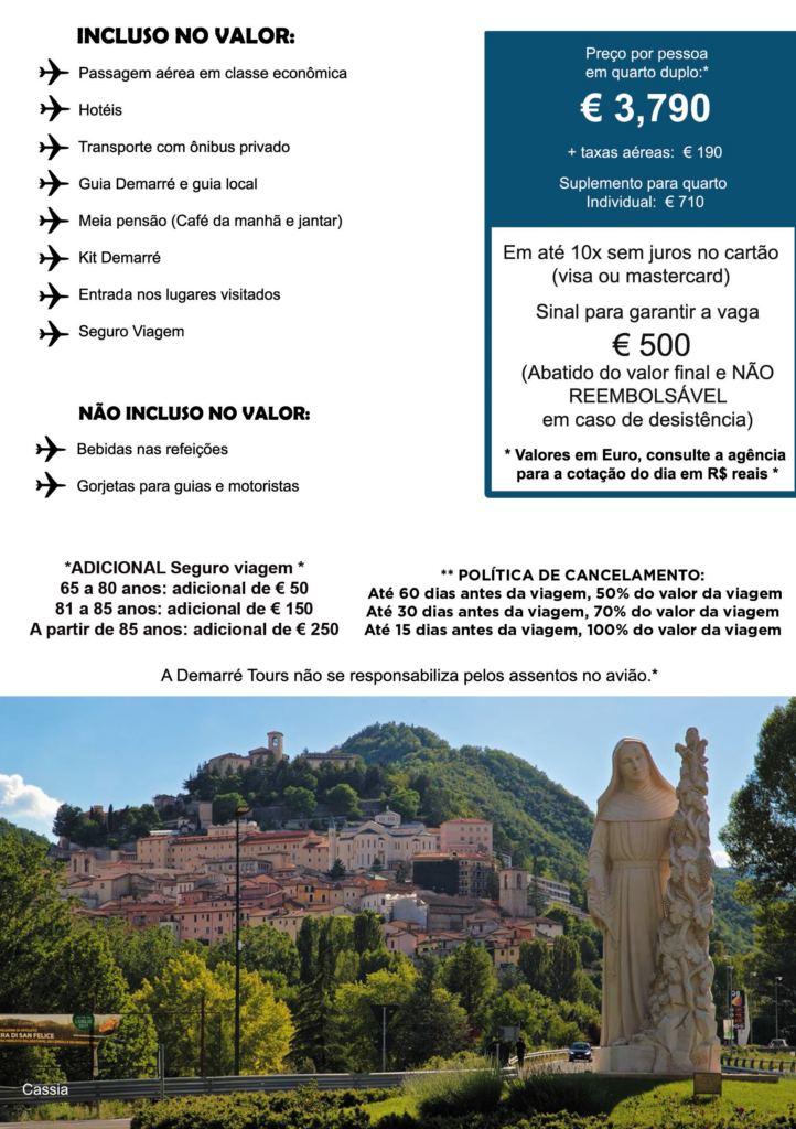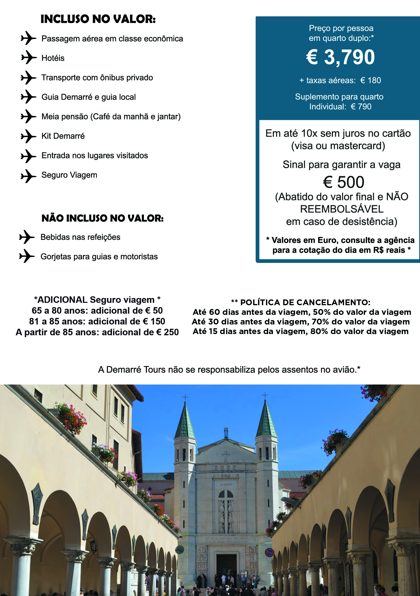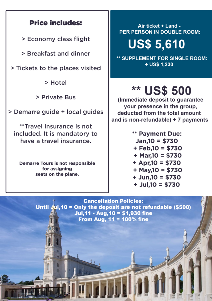 O intuito da Demarré Tours é que o passageiro mexa o menos possível em seu dinheiro durante a peregrinação. Nos roteiros onde disponibilizamos a pensão completa (café + almoço + jantar), recomendamos que o passageiro leve um mínimo de $20 dólares por dia (ou $20 euros por dia, dependendo da moeda do país visitado).