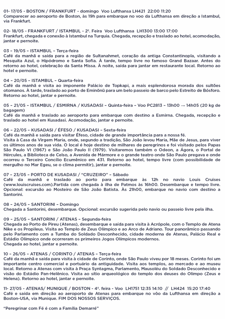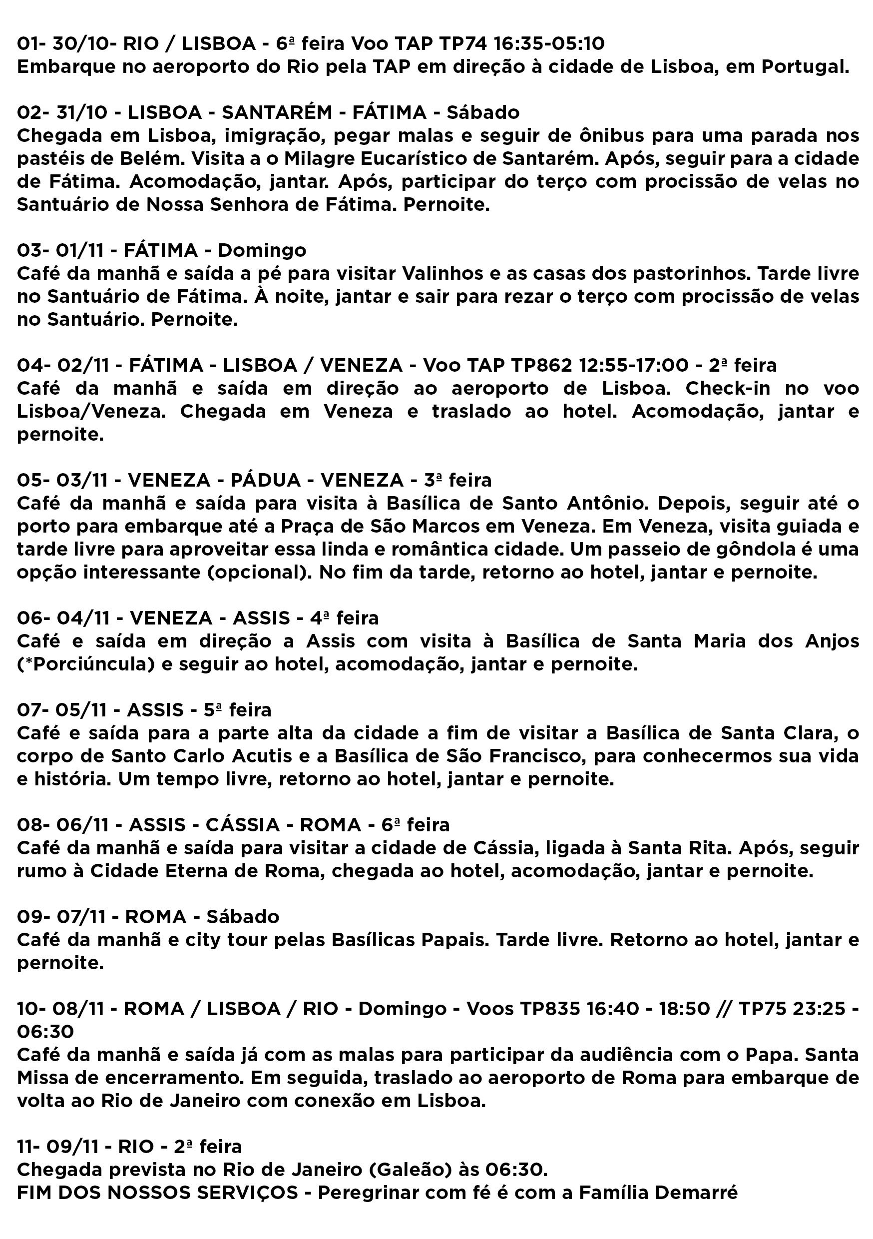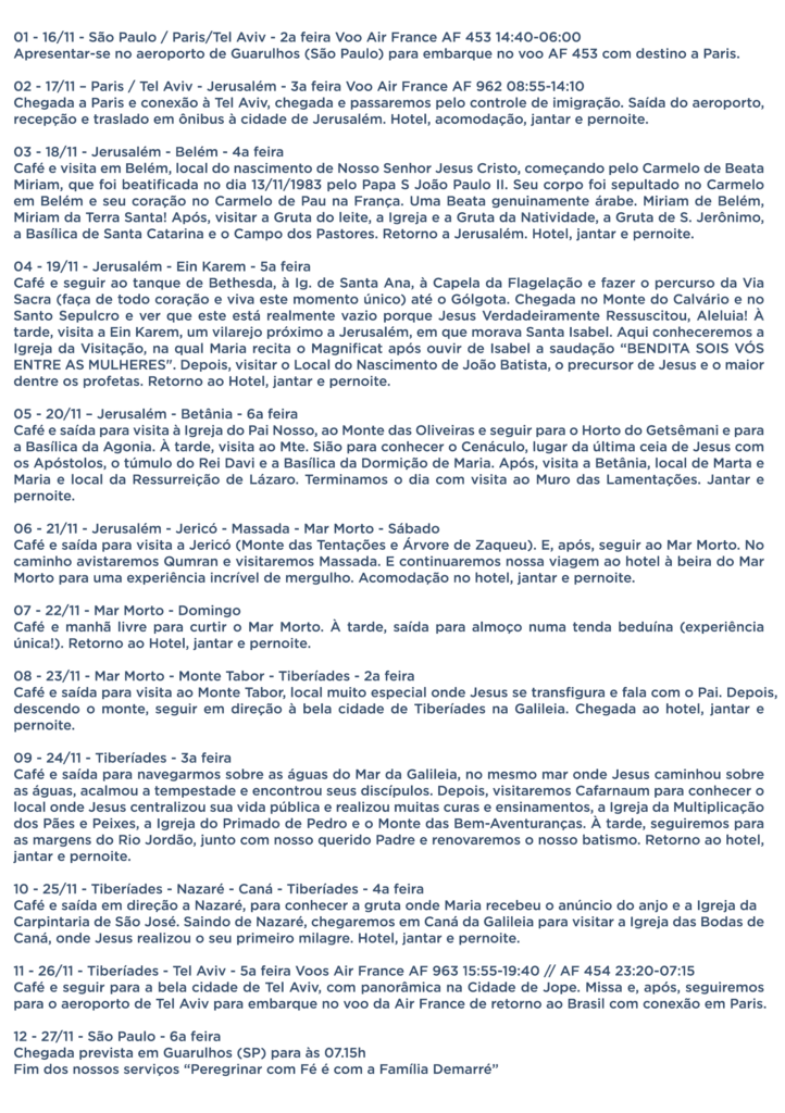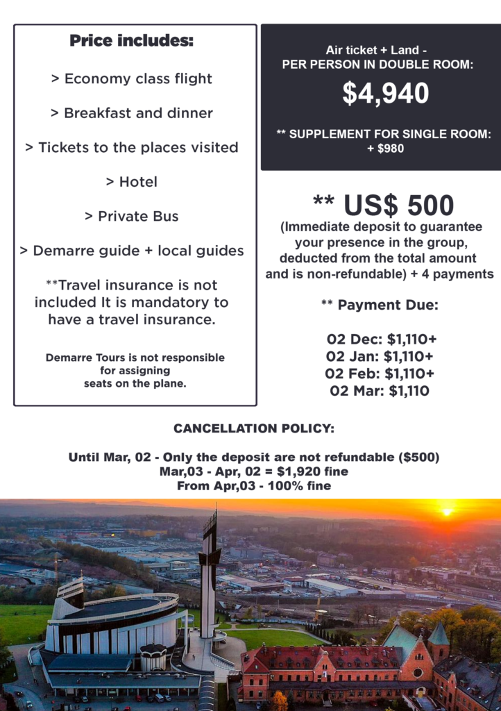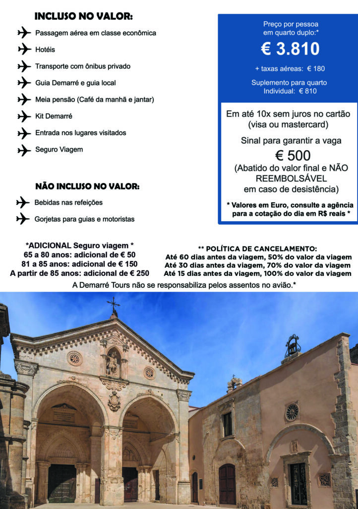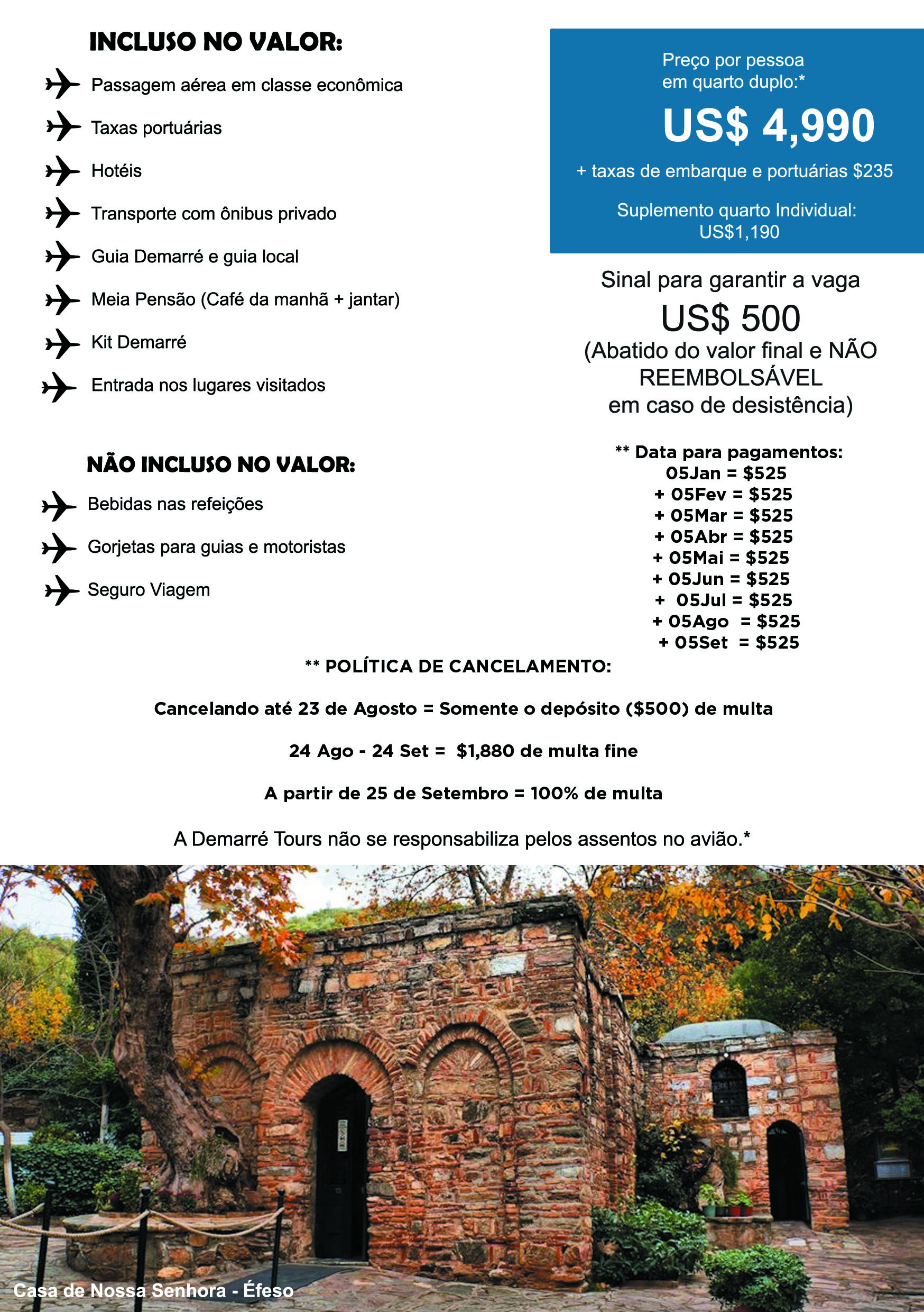 O intuito da Demarré Tours é que o passageiro mexa o menos possível em seu dinheiro durante a peregrinação. Nos roteiros onde disponibilizamos a pensão completa (café + almoço + jantar), recomendamos que o passageiro leve um mínimo de $20 dólares por dia (ou $20 euros por dia, dependendo da moeda do país visitado).