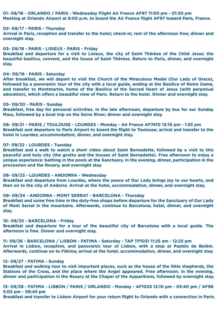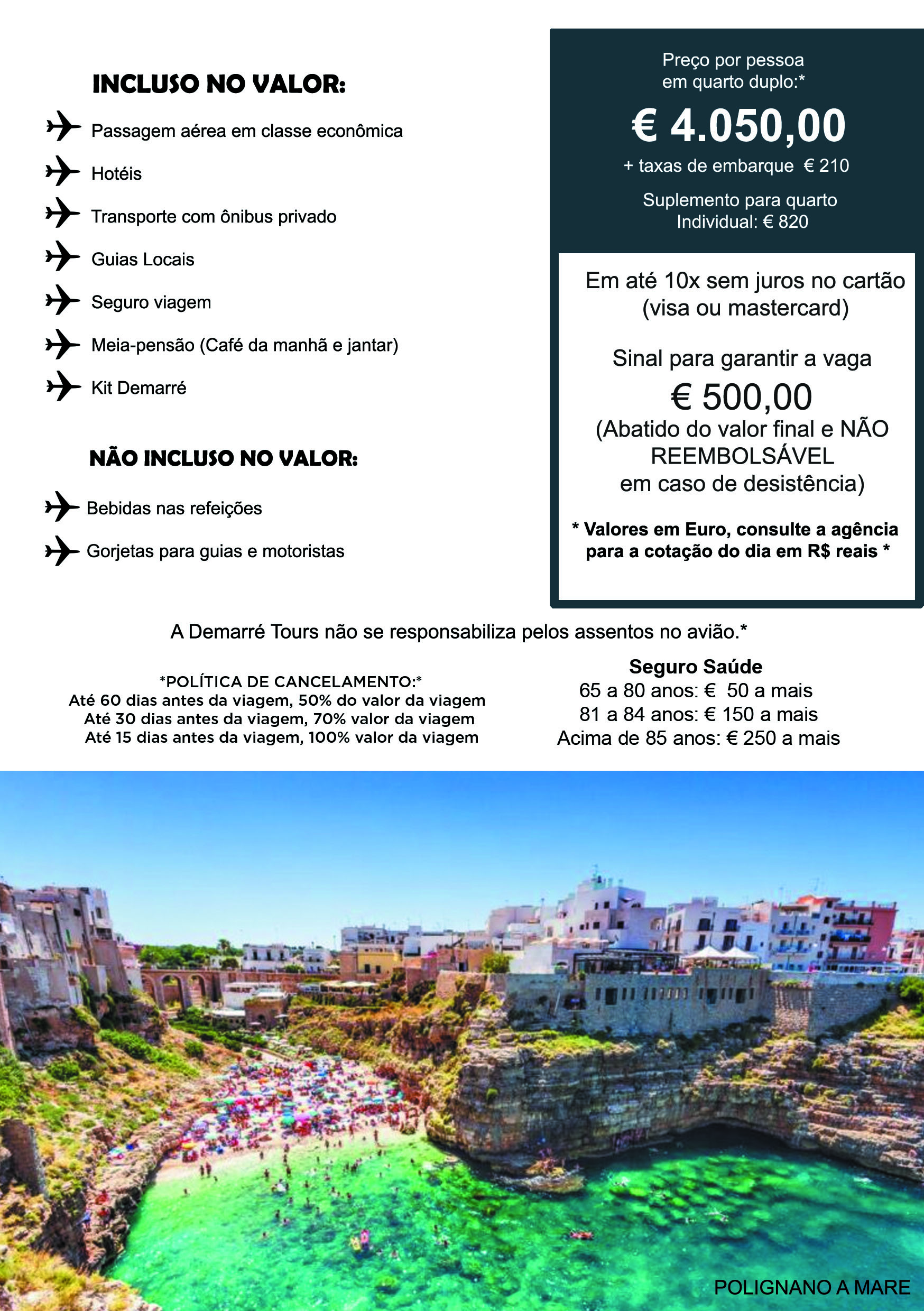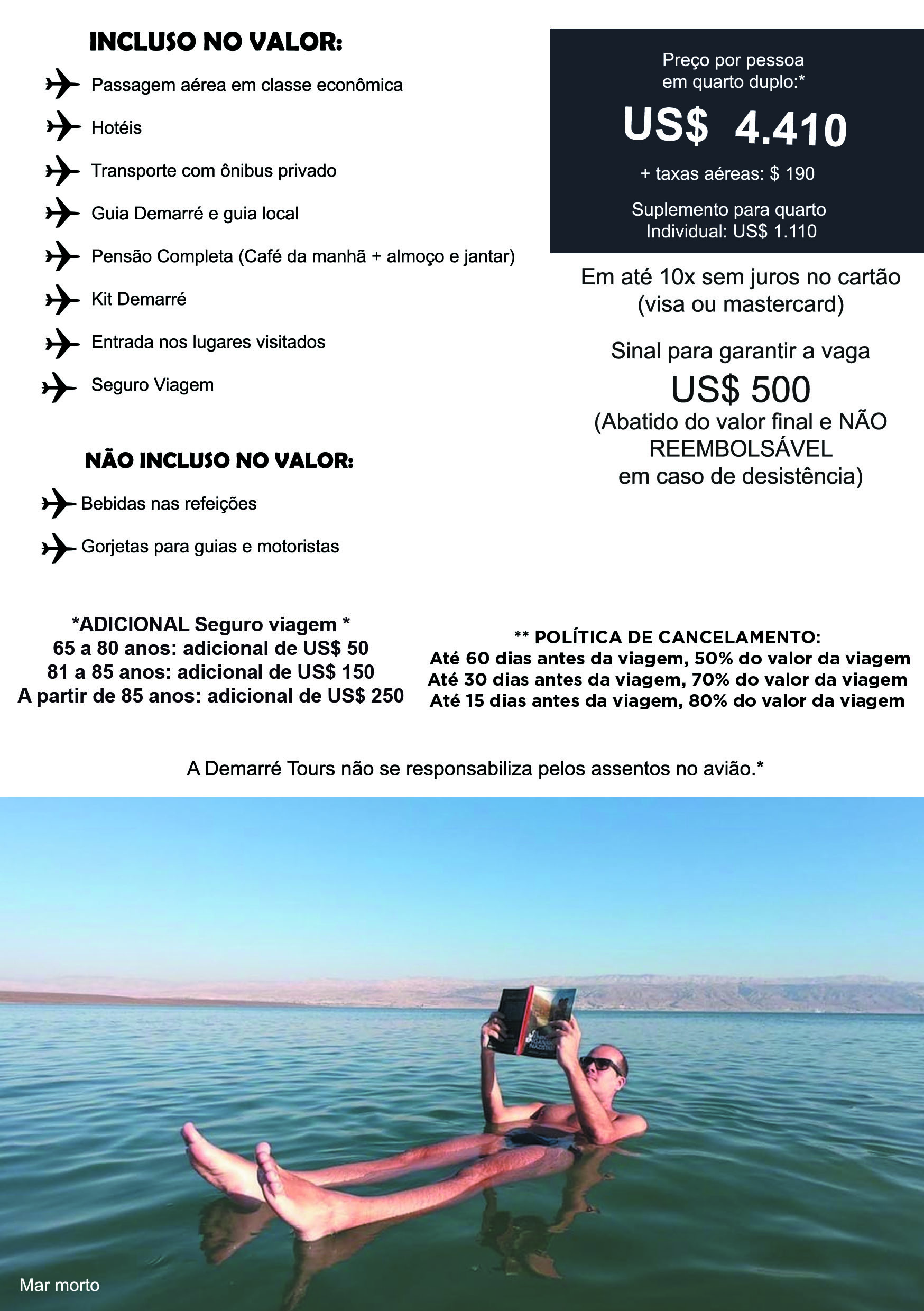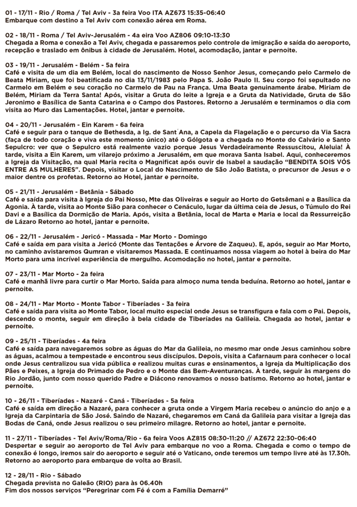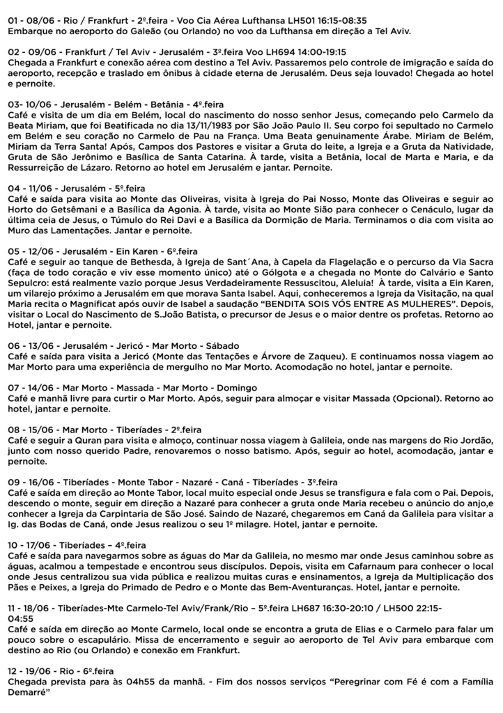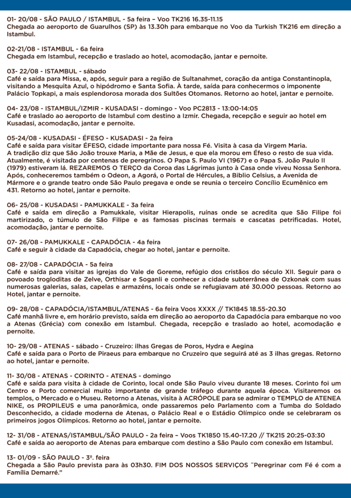 O intuito da Demarré Tours é que o passageiro mexa o menos possível em seu dinheiro durante a peregrinação. Nos roteiros onde disponibilizamos a pensão completa (café + almoço + jantar), recomendamos que o passageiro leve um mínimo de $20 dólares por dia (ou $20 euros por dia, dependendo da moeda do país visitado).