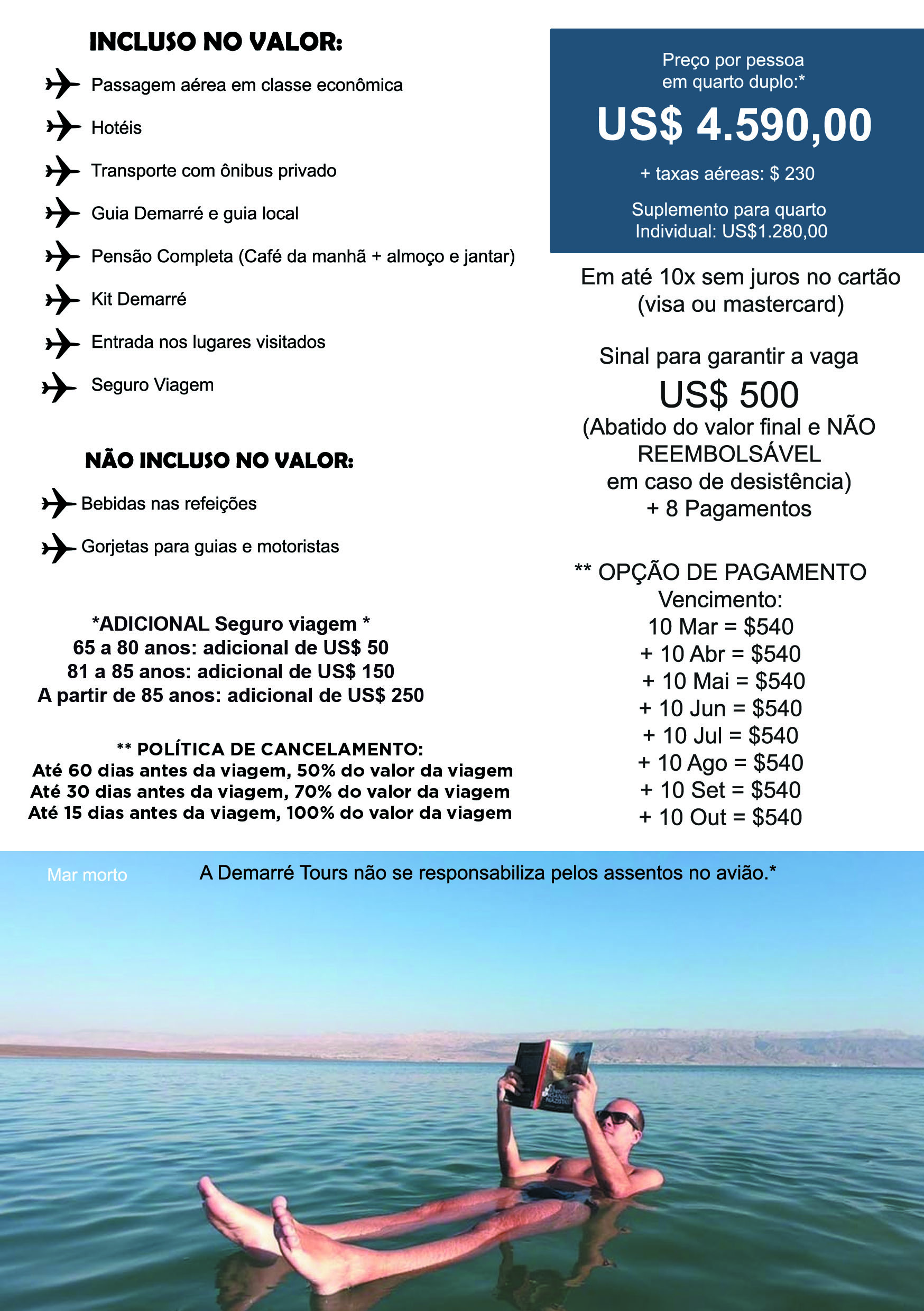 Um dos maiores diferenciais da Demarré Tours, é sem dúvida, a forma de pagamento. Após o pagamento do sinal (sinal pode variar entre $300 e $500 dólares e é abatido do valor final), o passageiro pode ir abatendo o restante do pagamento da forma como ele preferir, ou seja, ele pode pagar o montante que desejar, no dia que desejar. Chegando 60 dias antes do embarque, o passageiro pode ainda dividir o restante não pago em até 10x sem juros no cartão.